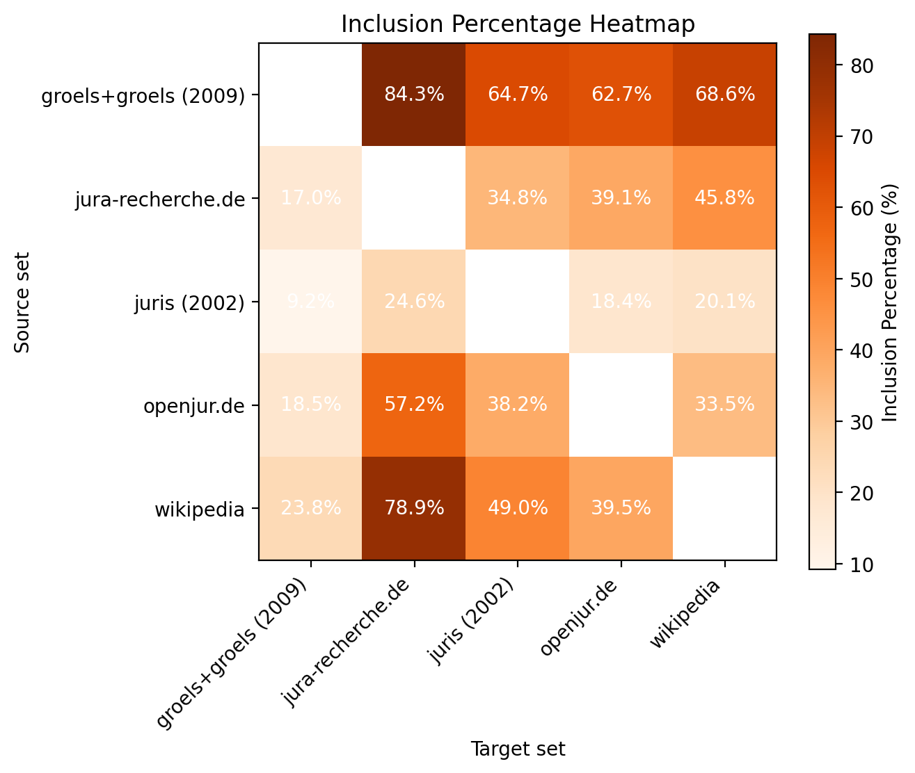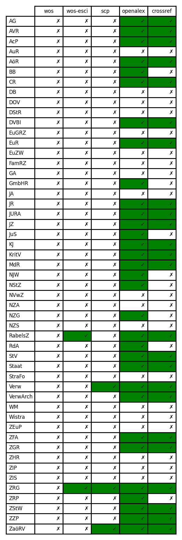 Our aim was to examine the coverage of German-language, more specifically, Germany-based law journals in the Web of Science, Scopus and OpenAlex bibliometric databases. In order to do that, we derived a list of law journals (our benchmark set) from a study that had surveyed German law professors about which journals they considered most important in their field. We then queried the three data sources for the coverage of these journals.