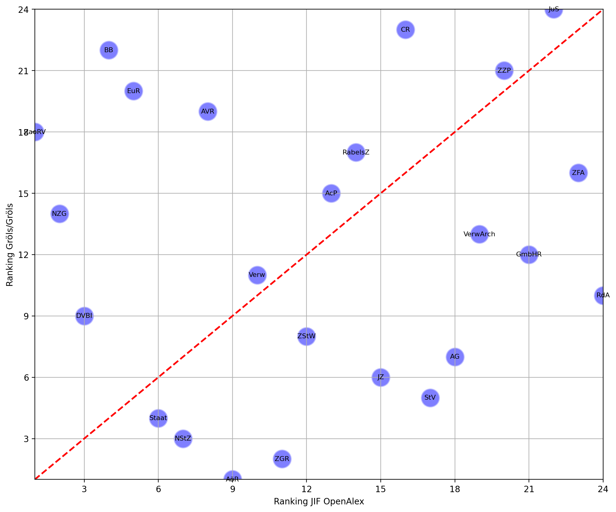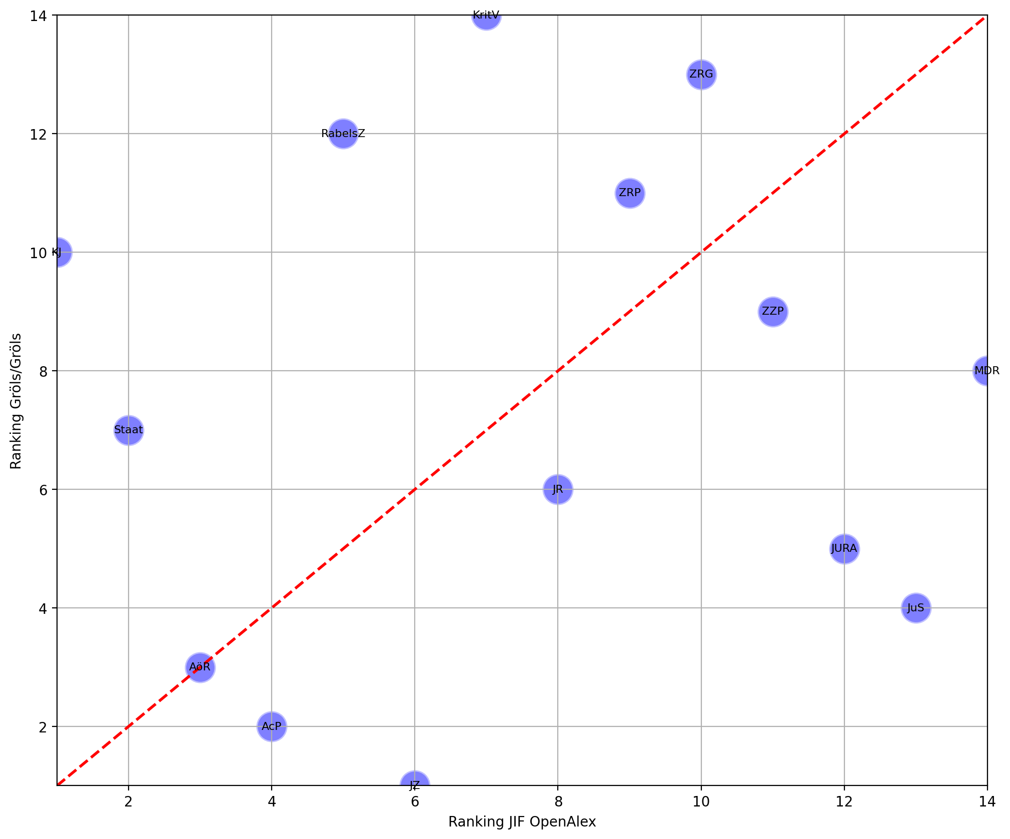 We compared the Gröls/Gröls ranking with the JIF-based ranking from OpenAlex separately for the generalist journals (Figure 13) and the specialized ones (Figure 14). Looking at the results, the rankings differ considerably.