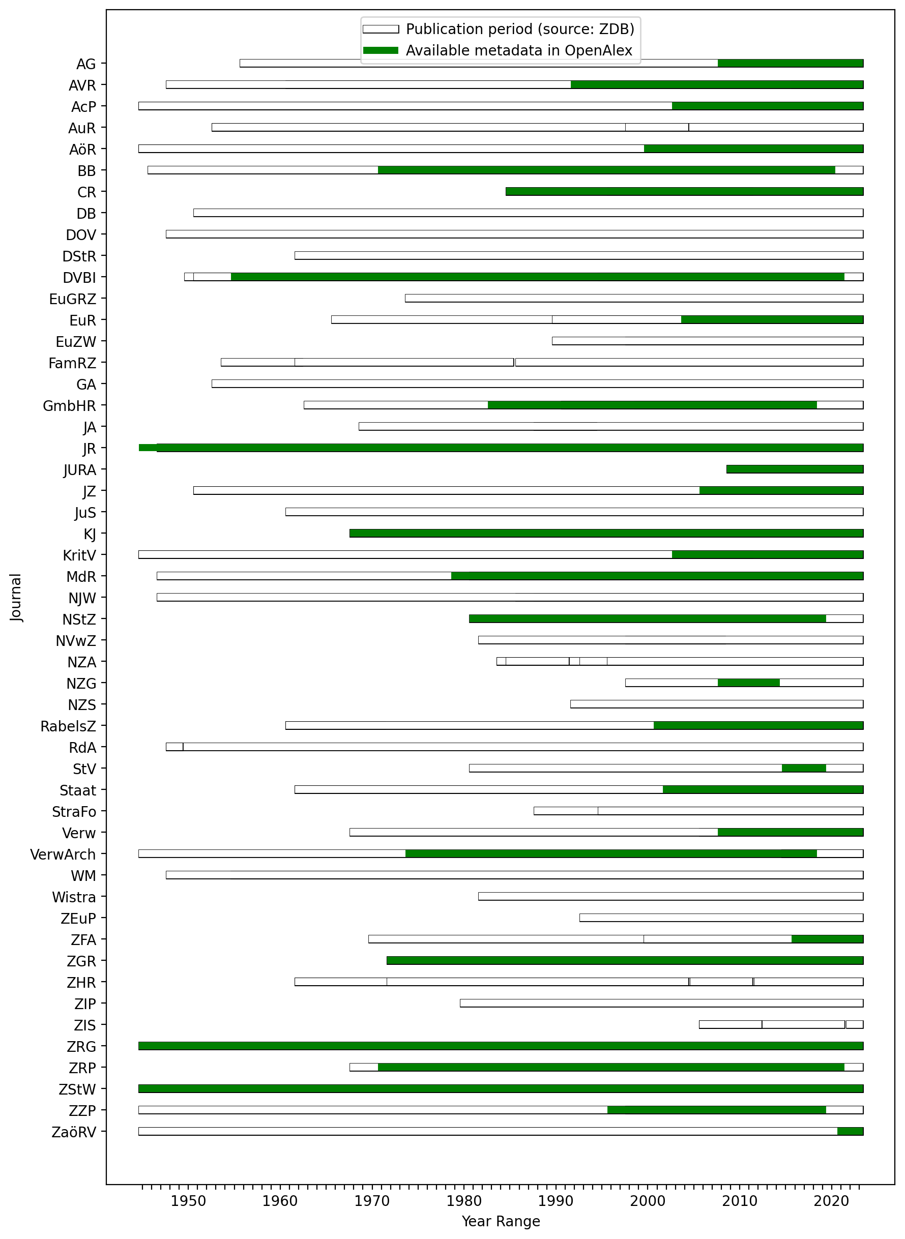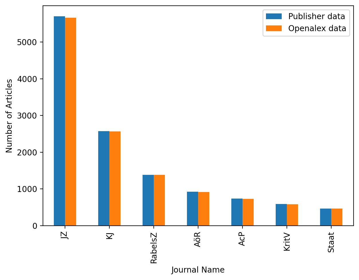 Looking at our results, it is clear that OpenAlex is the only one of the bibliometric databases examined which currently has a minimal coverage of German law journals as far as our benchmark set is representative. It offers a limited, but steadily growing basis for bibliometric queries.