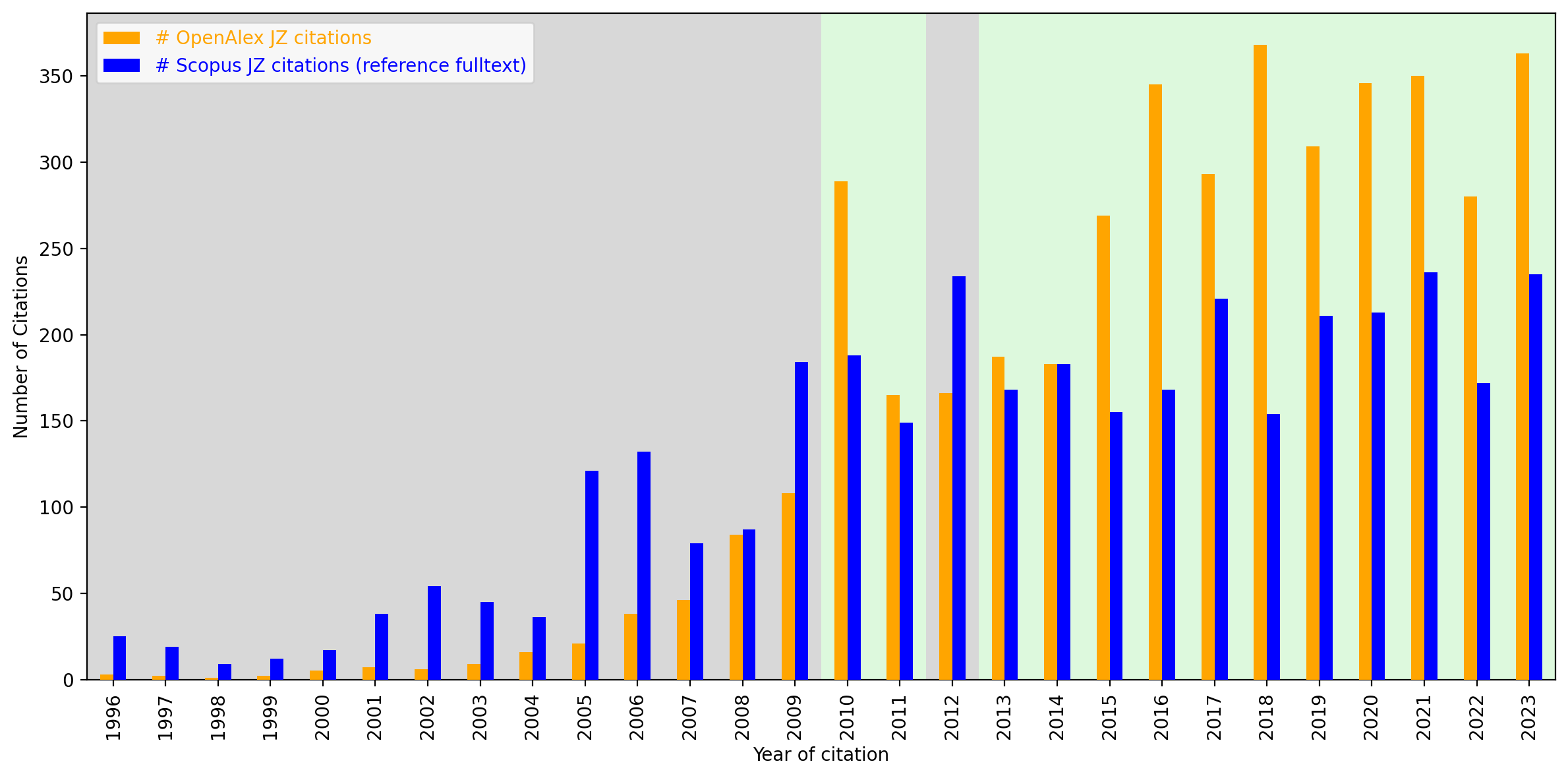 Figure 11: Comparison of citation data for the JZ in OpenAlex and Scopus reference full text