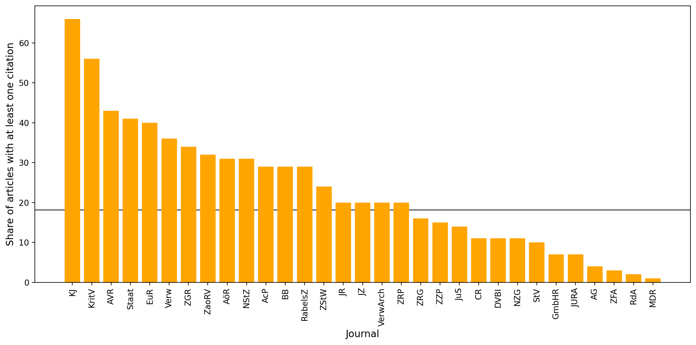 In addition, such studies point out that in the SSH fields, a large part of the research is published as monographs or parts thereof. These publications are even less present in databases which focus on journals, the main form of scientific communication in the natural sciences (Hammarfelt 2016). This is also true for German legal scholarship. However, this plays no role for the analyses in this paper, as our explicit focus is on law journals.3