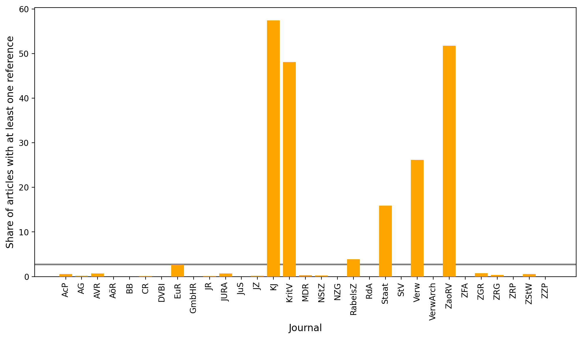 Bibliometric and scientometric analyses are common in many fields of research, being used for research assessment, i.e. the measurement of scholarly productivity and impact of institutions, journals, or individual scholars, or, alternatively, for science mapping, the empirical analysis of knowledge production in a particular field of scholarship (Raan 2019). However, this has not been the case for the field of German legal scholarship. One empirical indication of this state of affairs is that, when searching in the full texts of German law journal articles available on JSTOR for the expression “bibliometr*”, there are exactly two hits.1