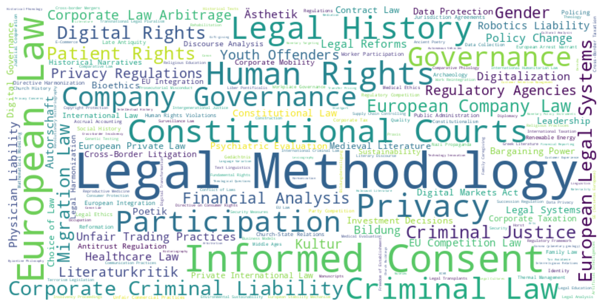 To further investigate the classification scheme, we focused on the level below subfields, namely topics. For articles from journals in our benchmark set, we would expect to see subfields of law represented. Using an open classification algorithm,27 OpenAlex assigns multiple topics to each article, along with a likelihood score. The works object in OpenAlex contains a keyword attribute, which is populated with up to 5 keywords derived from the topics, taking into account a threshold for likelihood. In order to get a first glance of the topics used, we generated a word cloud of these keywords. The resulting cloud contains sensible and relevant topics for our set.