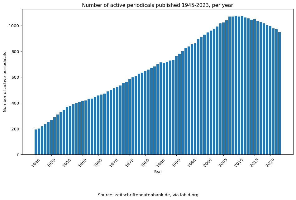 import matplotlib.pyplot as pltimport pandas as pddf = pd.read_csv('../data/zdb/zdb-ger-law-issn-1945-2023-years.csv', encoding='utf-8')plt.figure(figsize=(10, 6))plt.bar(df['year'], df['number_of_journals'])plt.xticks(df['year'][df['year'] %5==0], rotation=45)plt.xlabel('Year')plt.ylabel('Number of active periodicals')plt.title('Number of active periodicals published 1945-2023, per year')plt.figtext(0.5, -0.1, "Source: zeitschriftendatenbank.de, via lobid.org", ha="center", fontsize=10)plt.tight_layout()plt.show()